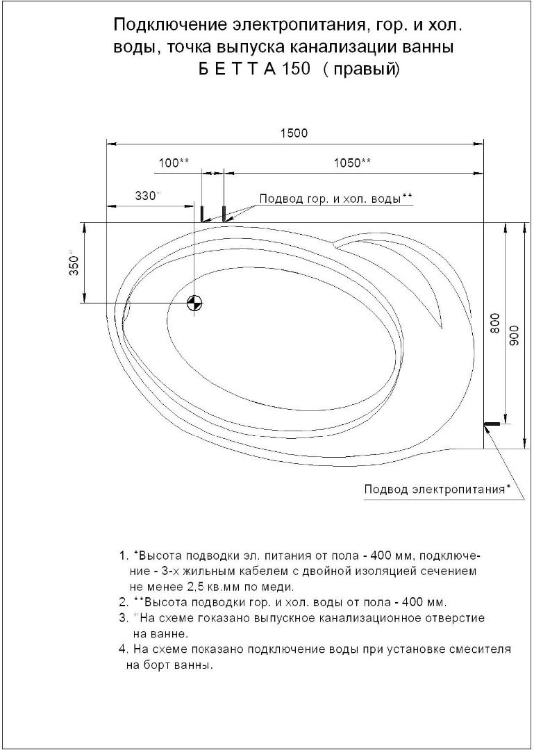 Ванна акриловая Aquatek Бетта, размер 1500x970 мм, цвет белый. Каркас, панель и сифон приобретается отдельно.