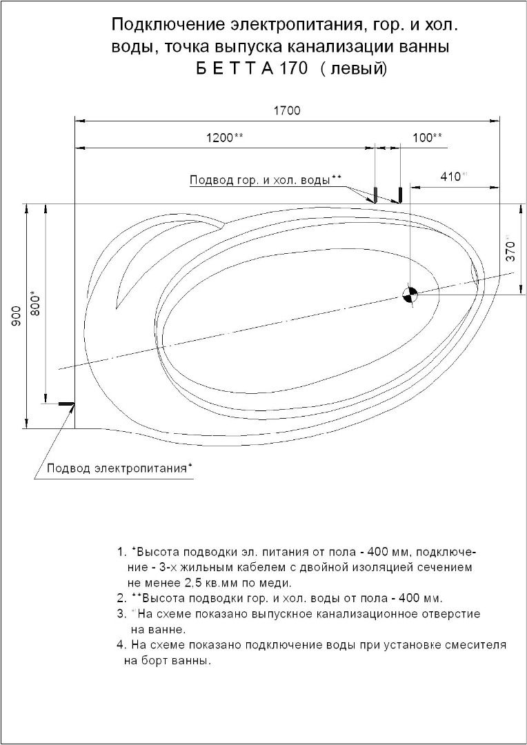 Ванна акриловая Aquatek Бетта, размер 1700x970 мм, цвет белый. Каркас, панель и сифон приобретается отдельно.