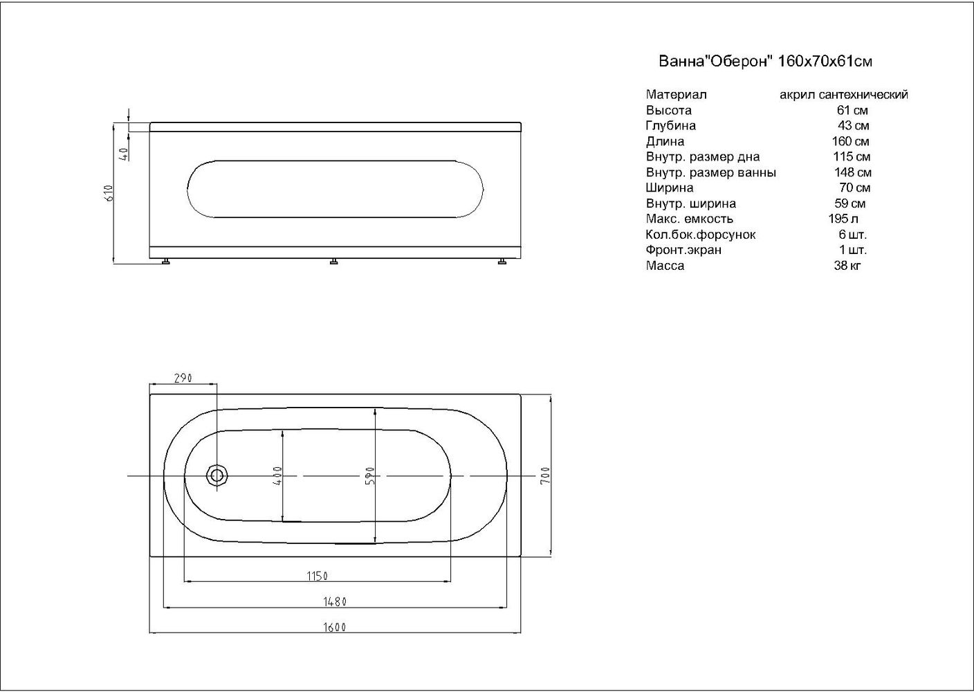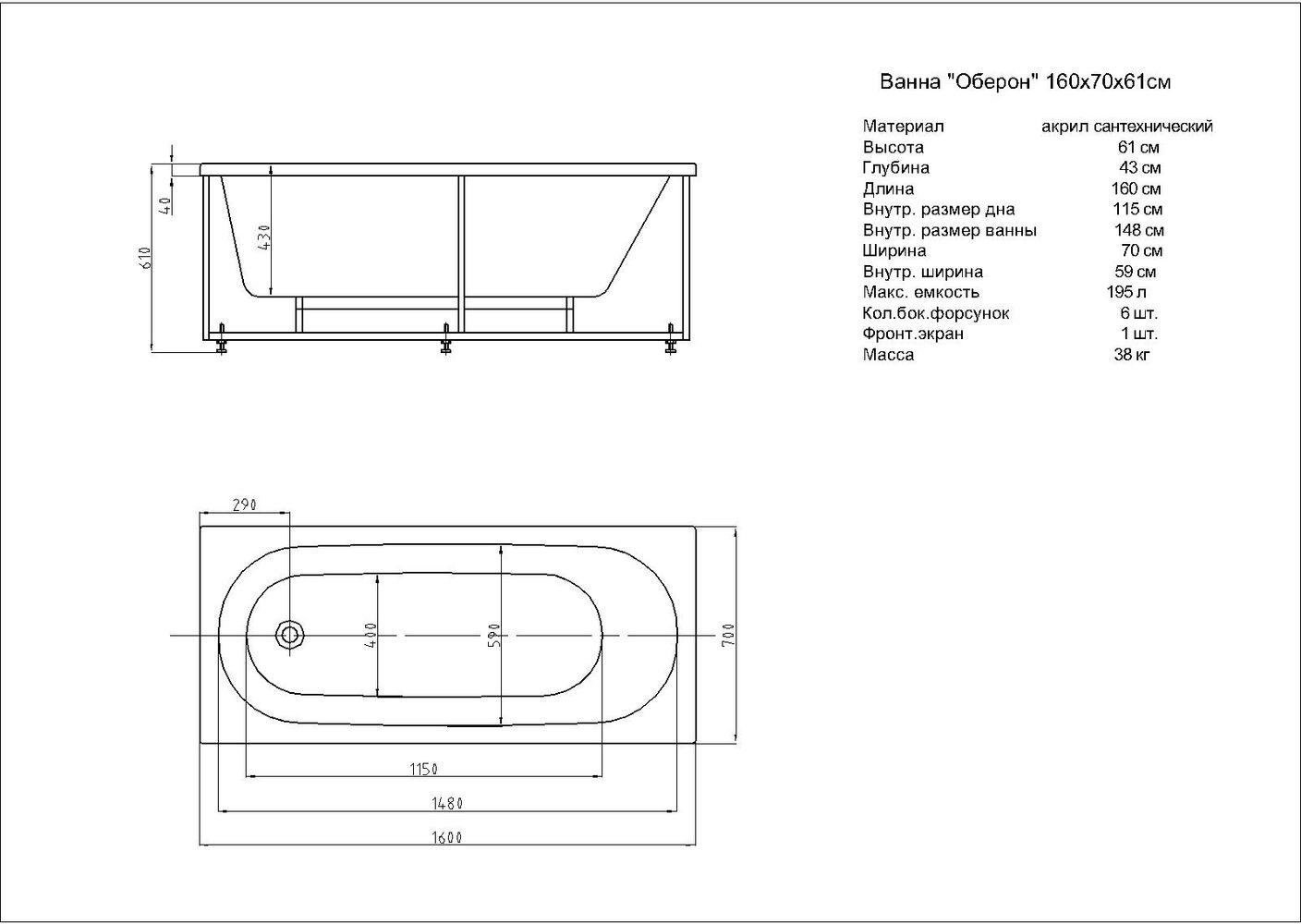 Ванна акриловая Aquatek Оберон, размер 1600x700 мм, цвет белый. Каркас, панель и сифон приобретается отдельно.