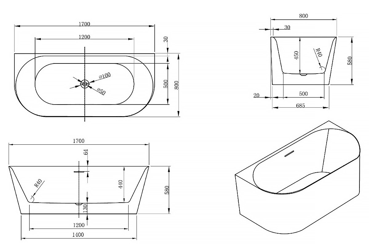 Ванна акриловая Azario MELADO 170x80 см AZ-7005-17W, в комплекте с сифоном и опорными ножками, цвет - белый.