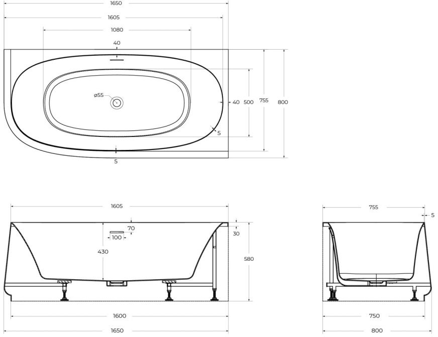 Описание ванна Cezares CZR-LUX-CORNER-165-80-58-R