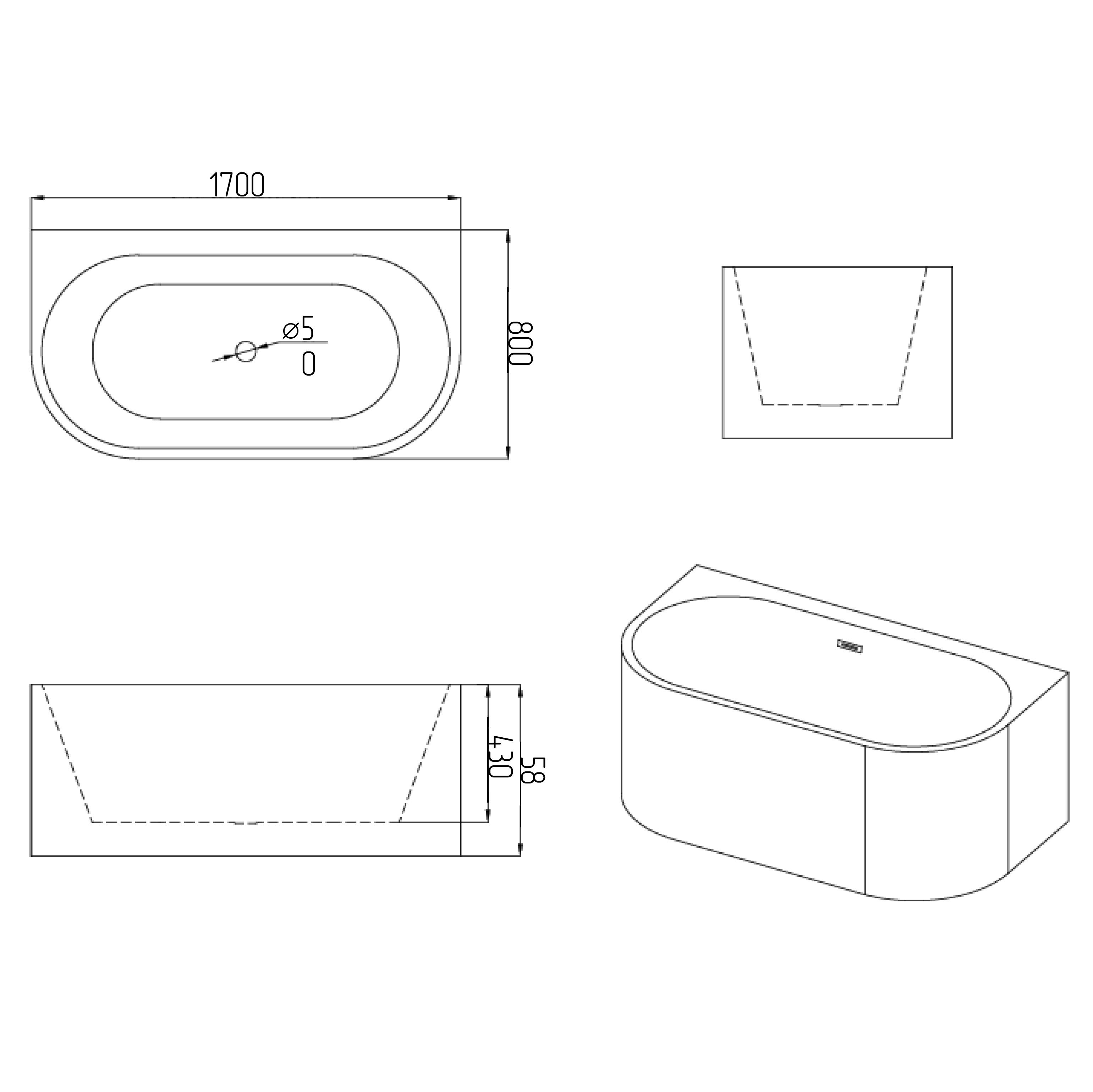Ванна акриловая Grossman Cristal GR-17073, размеры 1700x800x580 мм, сифон в комплекте, цвет белый.