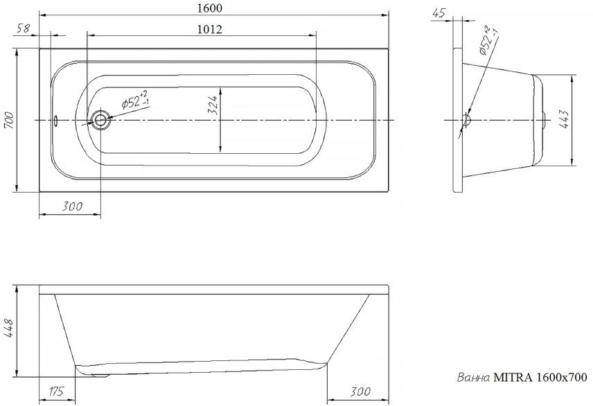 Ванна акриловая Vento Italy Mitra, размер 1600х700 мм, цвет белый. Панель, каркас/ножки и сифон приобретается отдельно.
