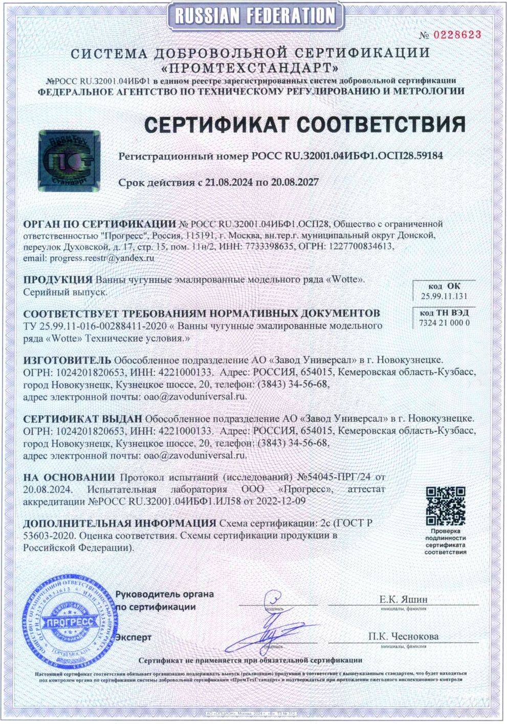 Толщина стенки чугунной ванны бренда Wotte составляет 5 мм ±0,5 мм, толщина дна - 6 мм ±0,5 мм.