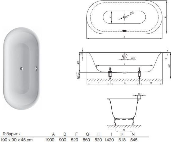 Ванна cтальная Bette Lux Oval с шумоизоляцией и покрытиями Bette Glasur ® Plus, для удлиненного слив-перелива, размер: 1900х900х450 мм. Цвет белый.