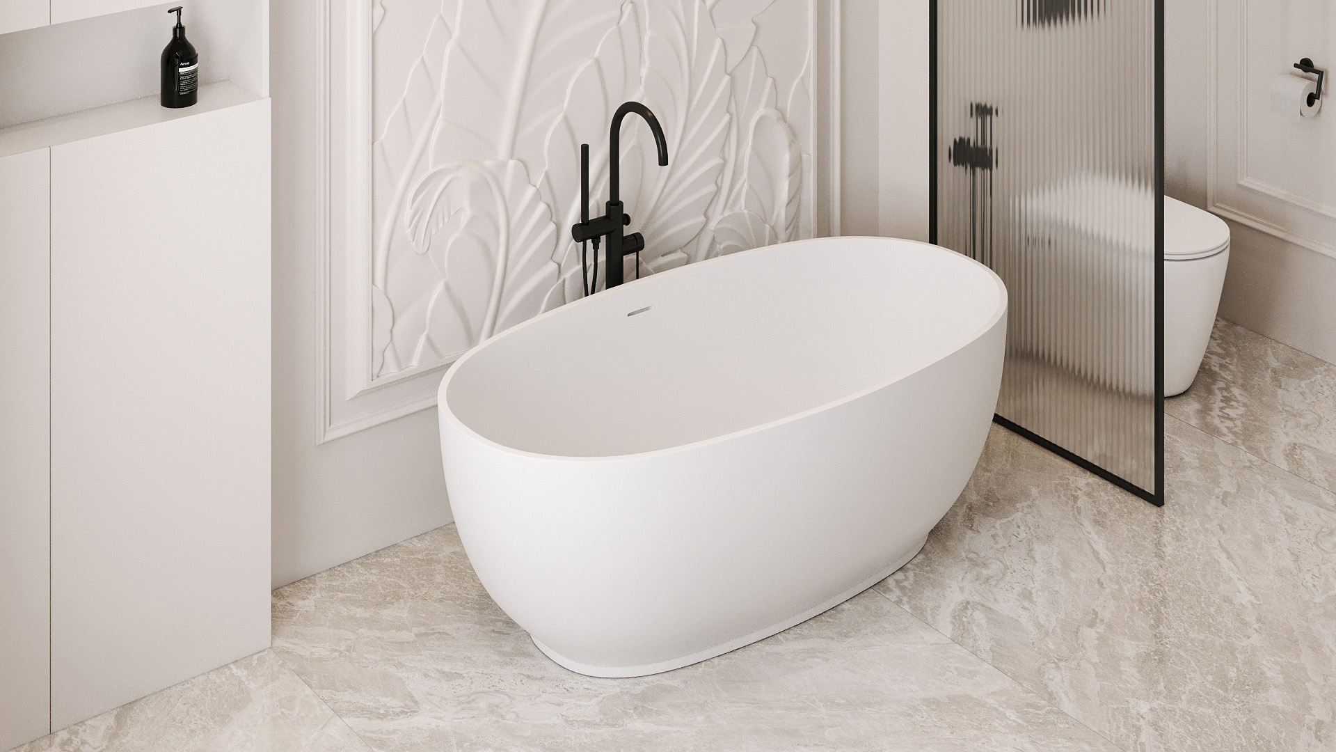 Ванна каменная Abber Stein, размер 130x68 см, слив-перелив в комплекте, цвет белый матовый.