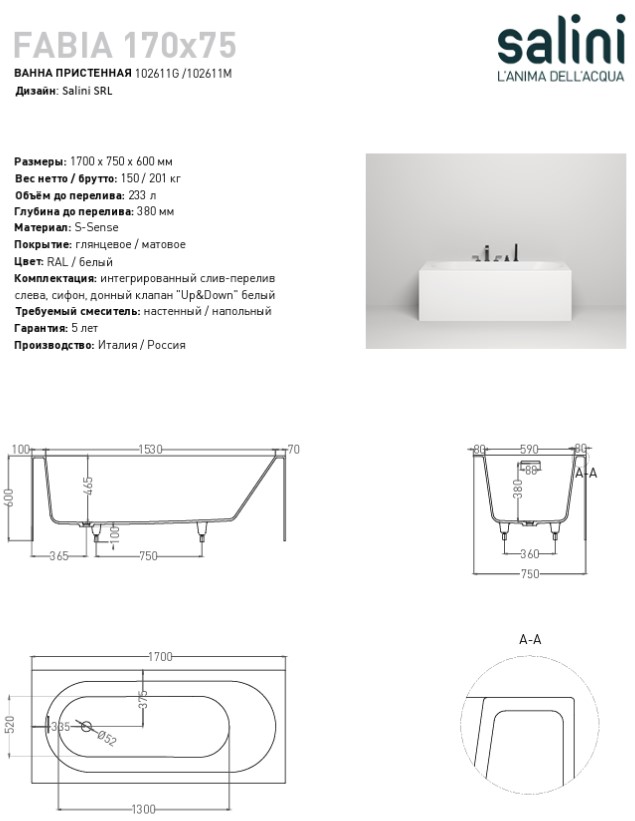 Ванна каменная Salini Fabia, размер 1700х750х600 мм, встроенный слив-перелив. Донный клапан и опорная рама в комплекте.