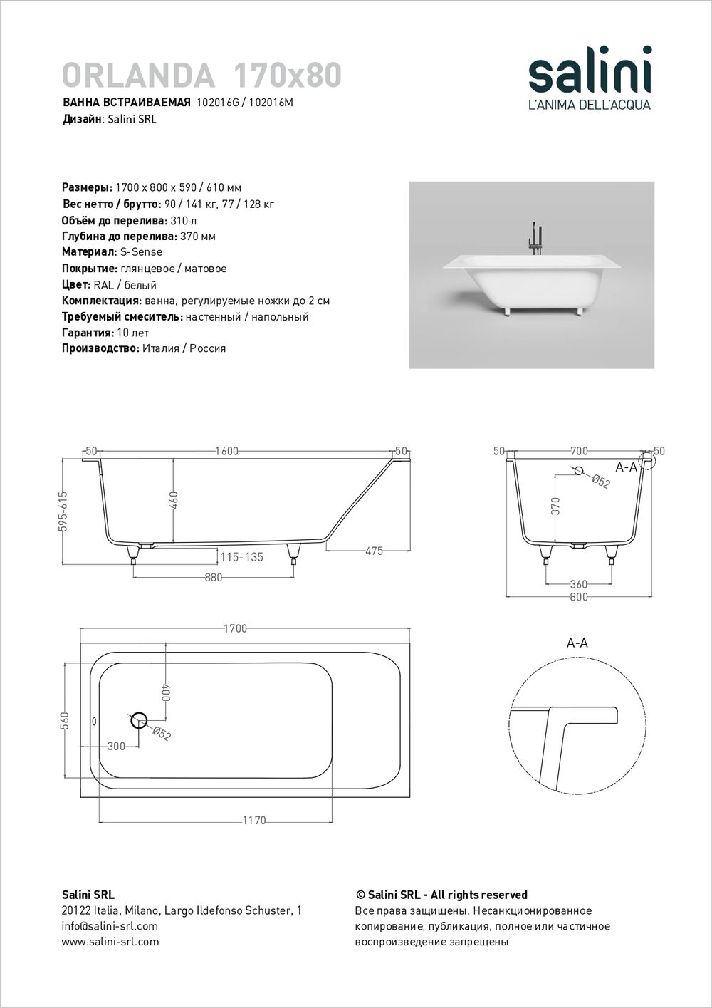 Ванна каменная Salini Orlanda 170x80 см 102016G (S-Sense) глянцевая