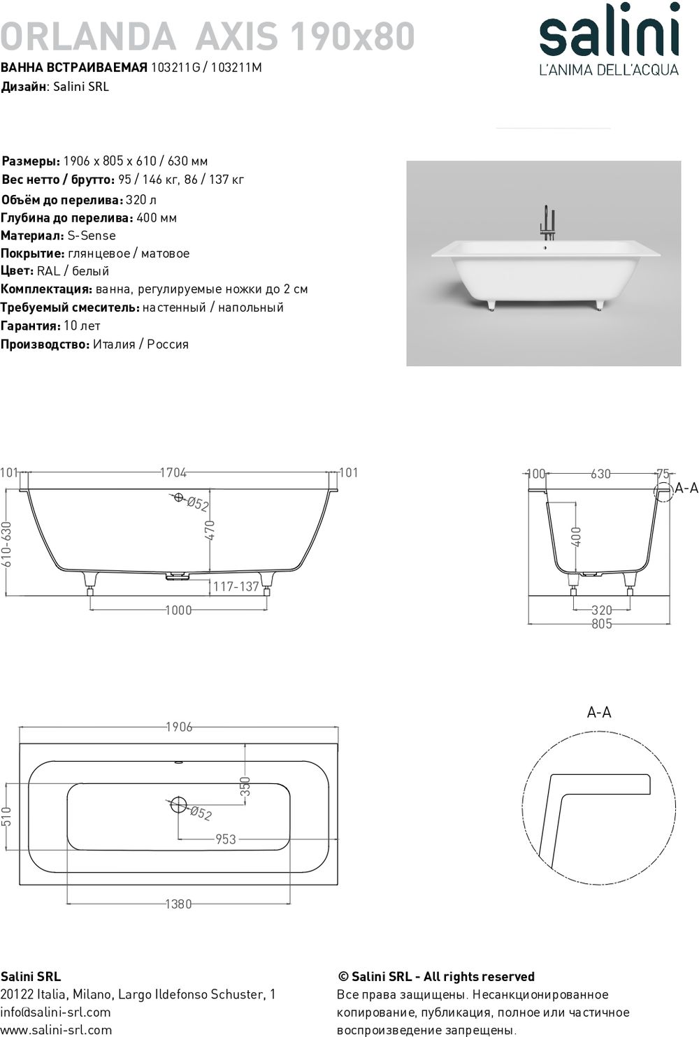 ORLANDA AXIS 190 - универсальная ванна Salini из литого камня.