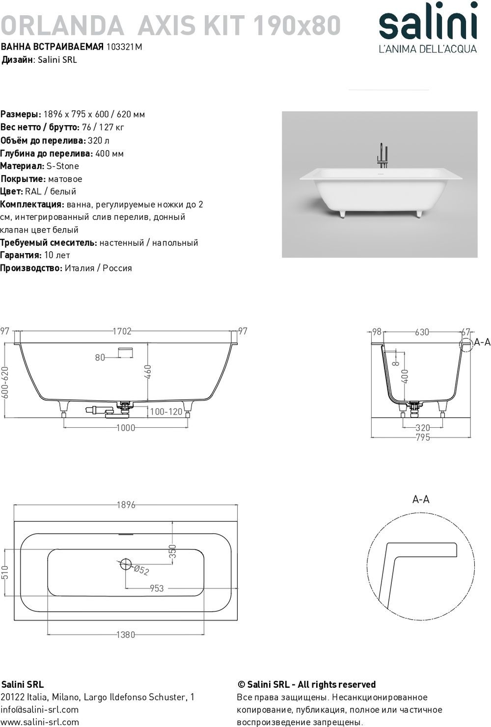 Ванна каменная Salini Orlanda 190x80 см 103321M (S-Stone) матовая