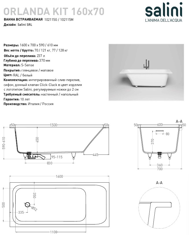 Ванна каменная Salini Orlanda Kit, размер 1600х700х590 мм. Цвет белый.