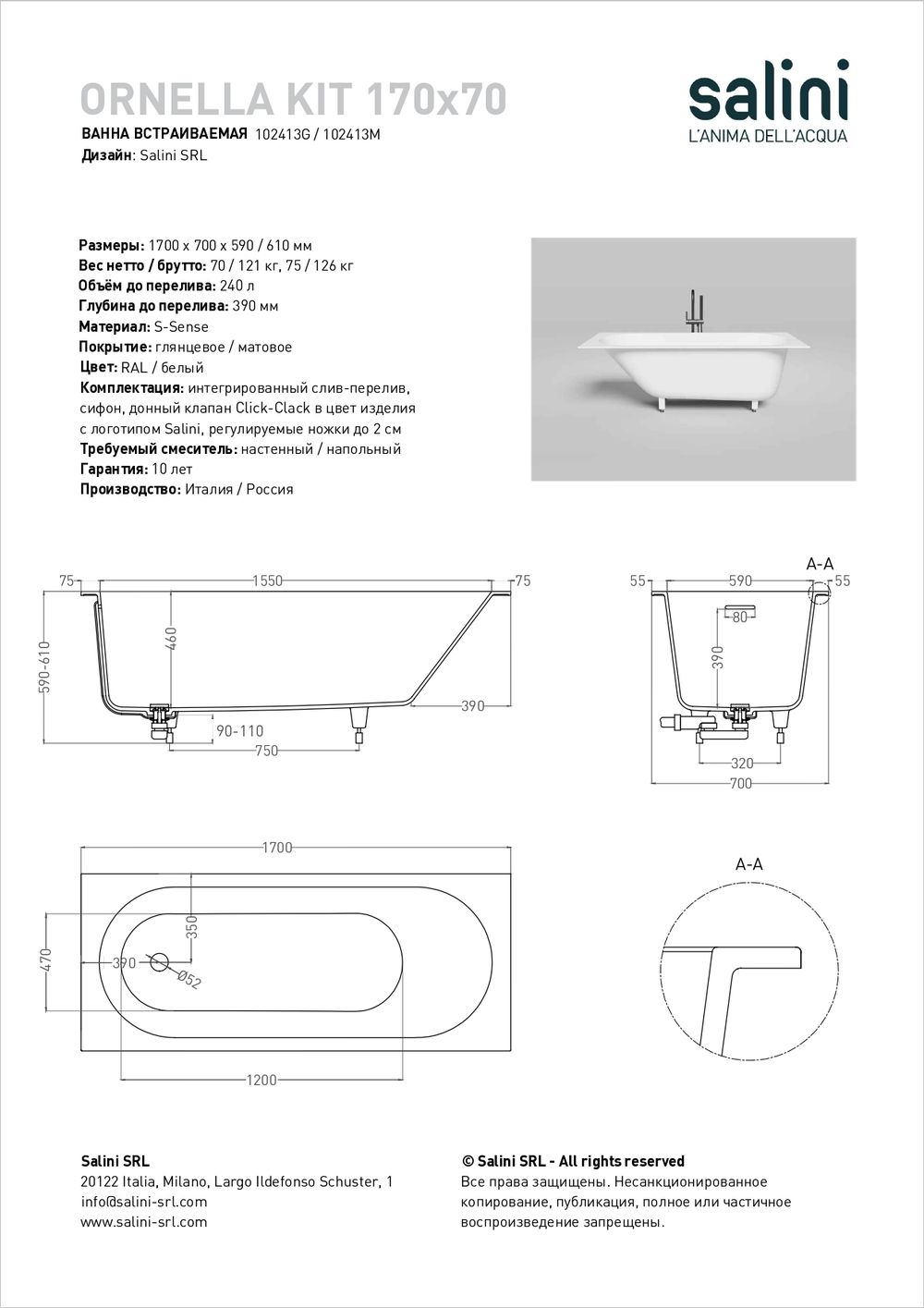 Ванна каменная Salini Ornella 170x70 см 102413G (S-Sense) глянцевая