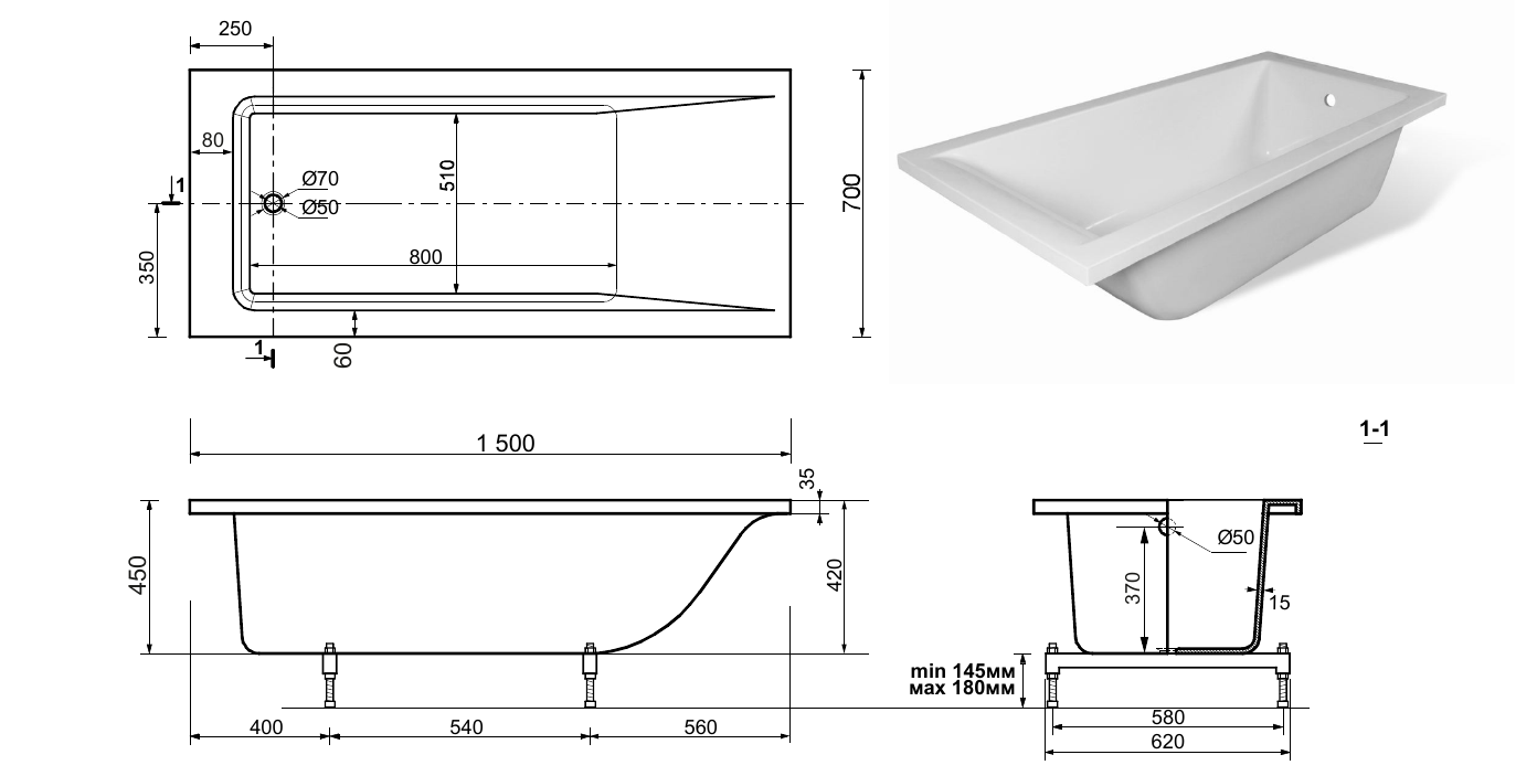 Ванна каменная Taliente Egoista EG2315070-1, размер 1500х70х595 мм, материал литьевой мрамор, цвет белый.