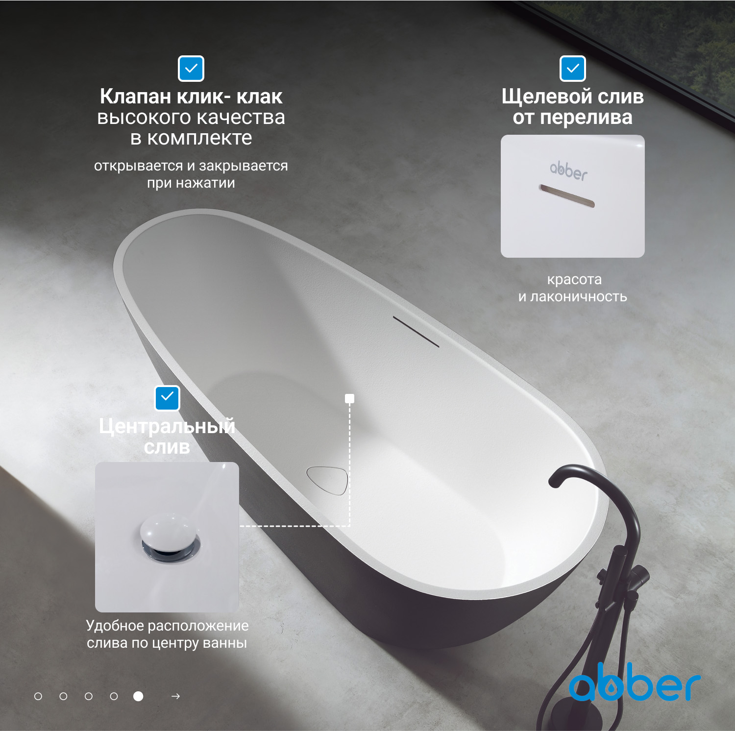 - Ванна выполнена из искусственного камня ABBER Rock - инновационный многослойный материал, который во многом превосходит акрил и литой искусственный камень.