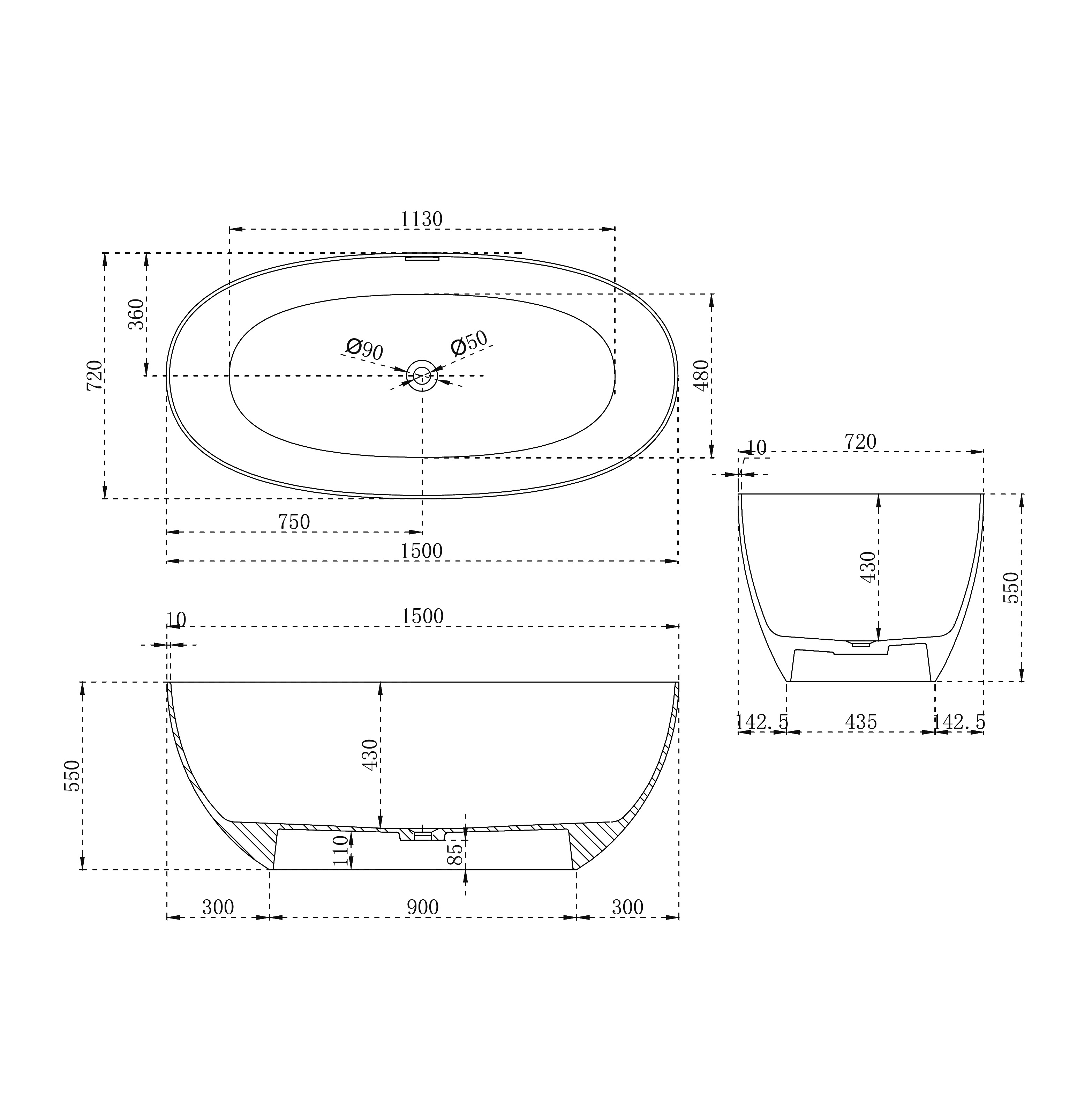 Ванна отдельностоящая Abber Stein 150x72 см AS9624-1.5 из искусственного камня, слив-перелив в комплекте, цвет - белый матовый.