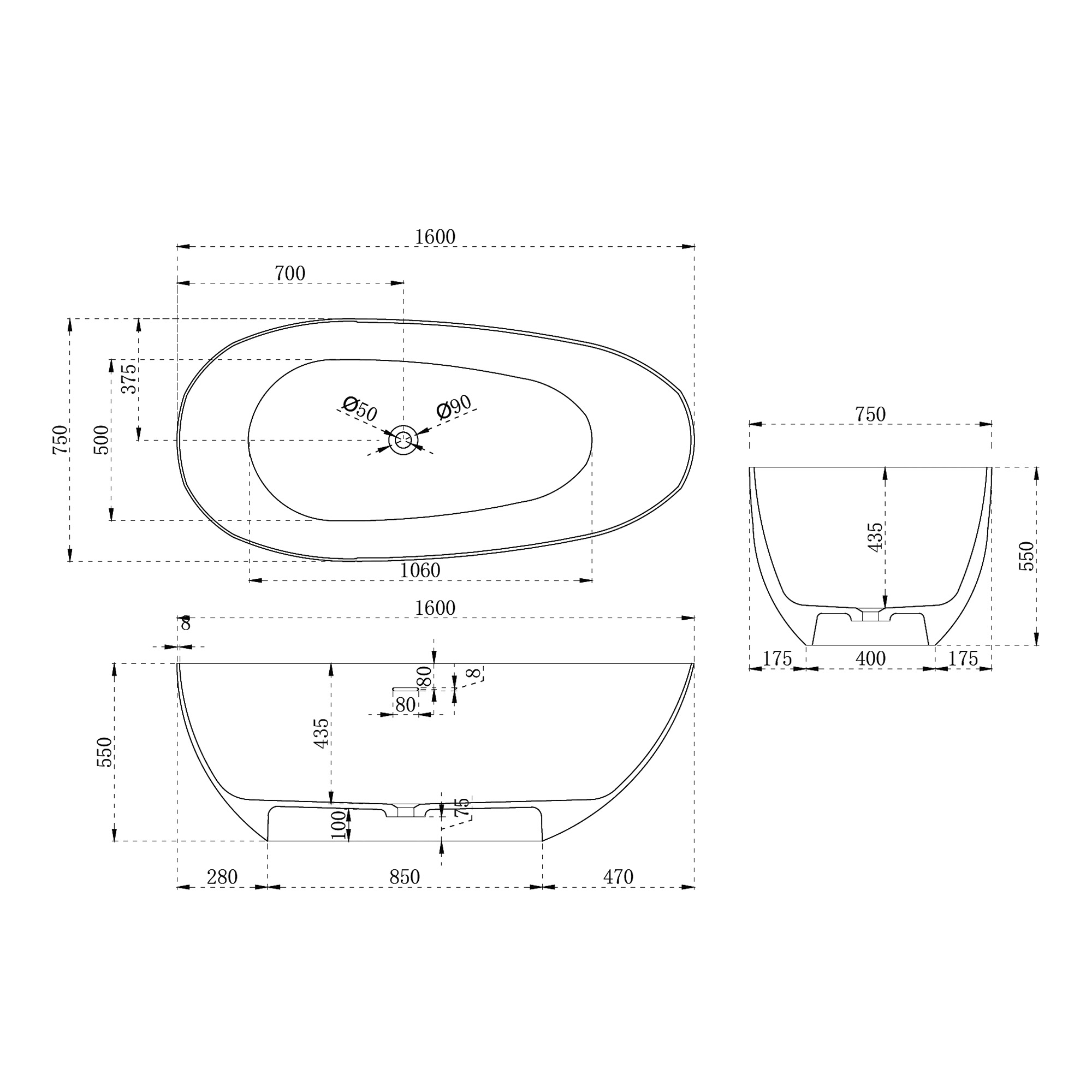 Ванна отдельностоящая Abber Stein 160x75 см AS9611-1.6, белый матовый
