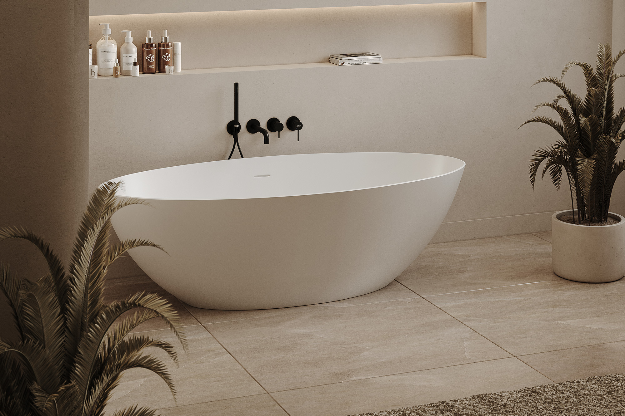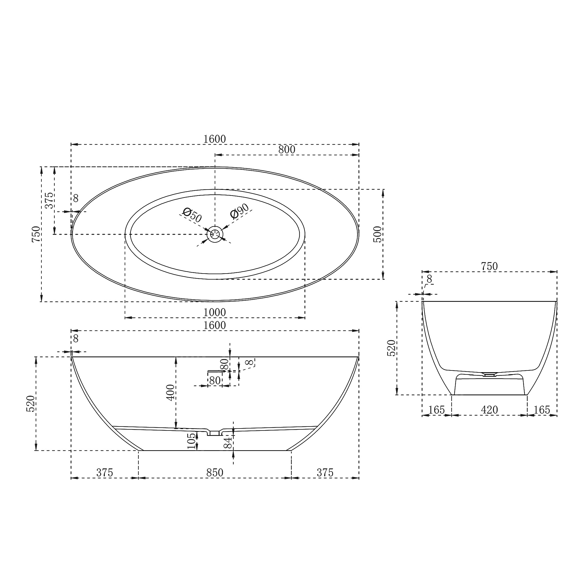 Ванна отдельностоящая Abber Stein 160x75 см AS9625-1.6 из искусственного камня, слив-перелив в комплекте, цвет - белый матовый.