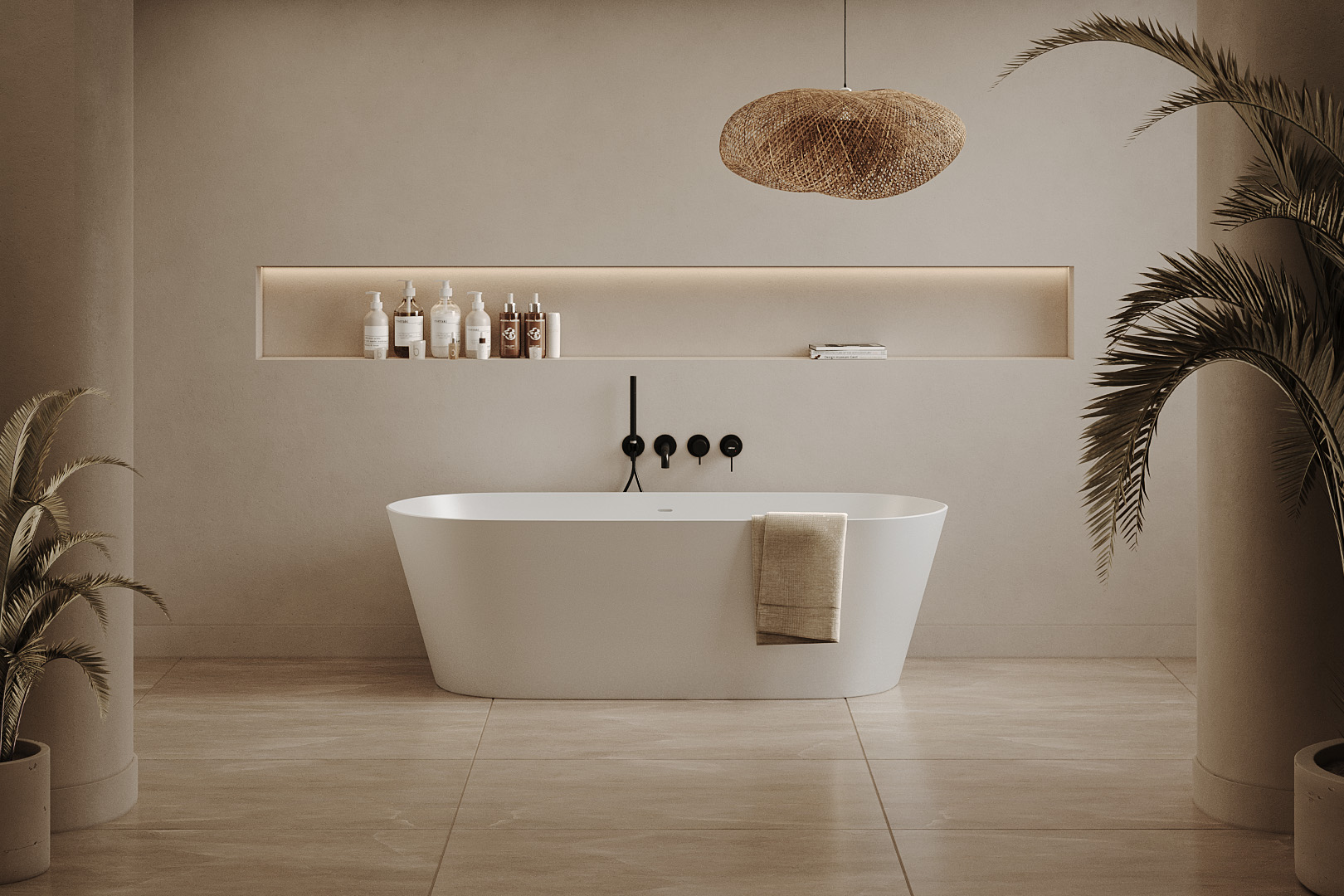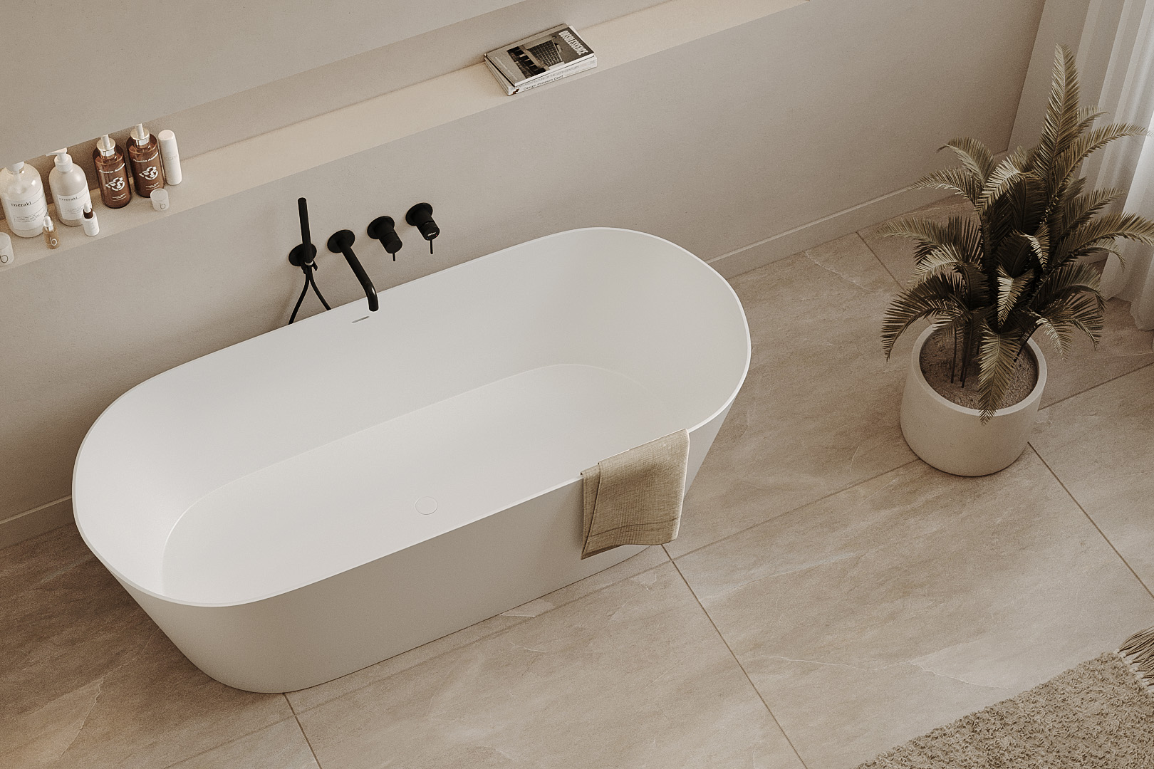Ванна отдельностоящая Abber Stein 165x70 см AS9622 из искусственного камня, слив-перелив в комплекте, цвет - белый матовый.