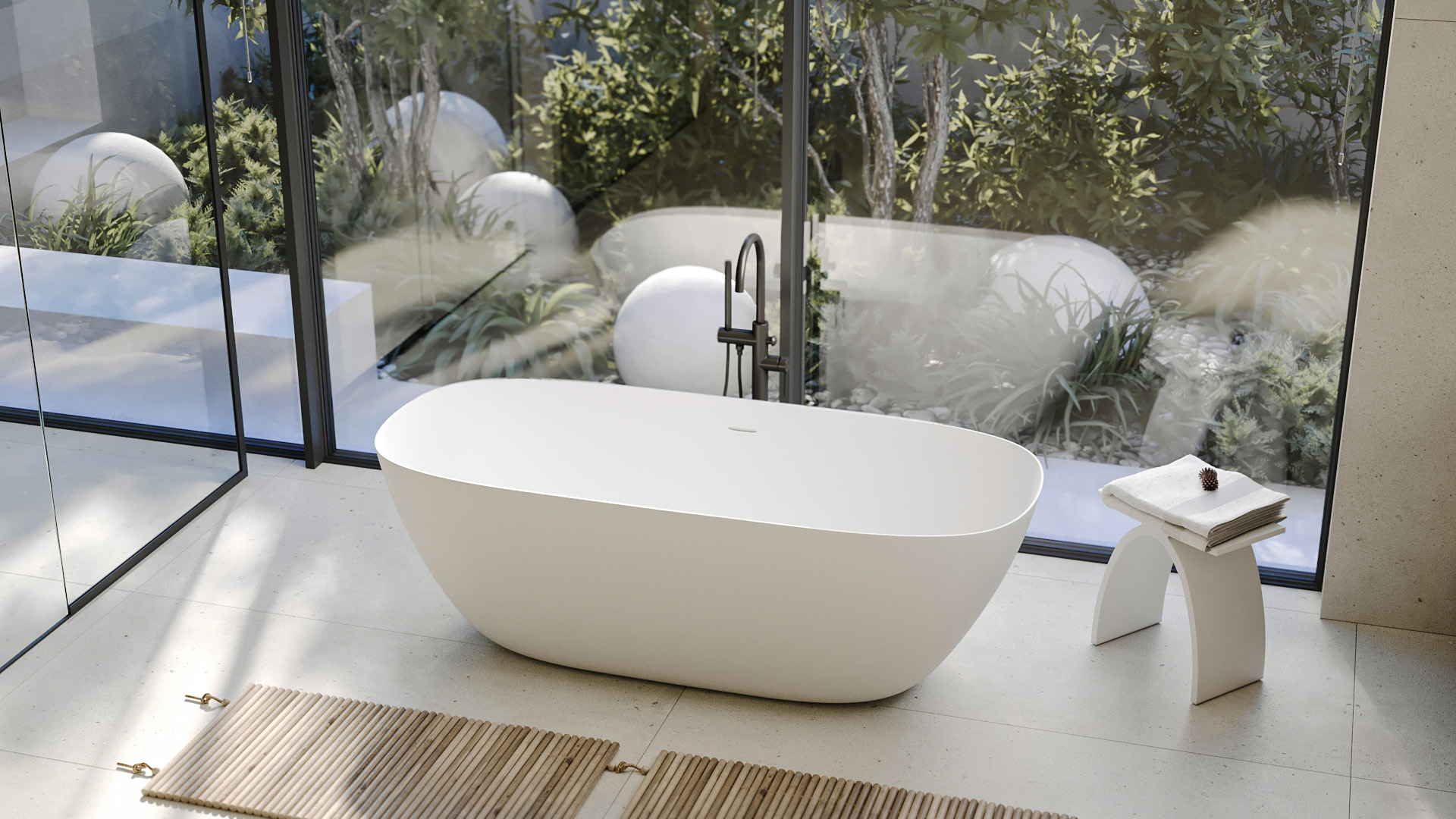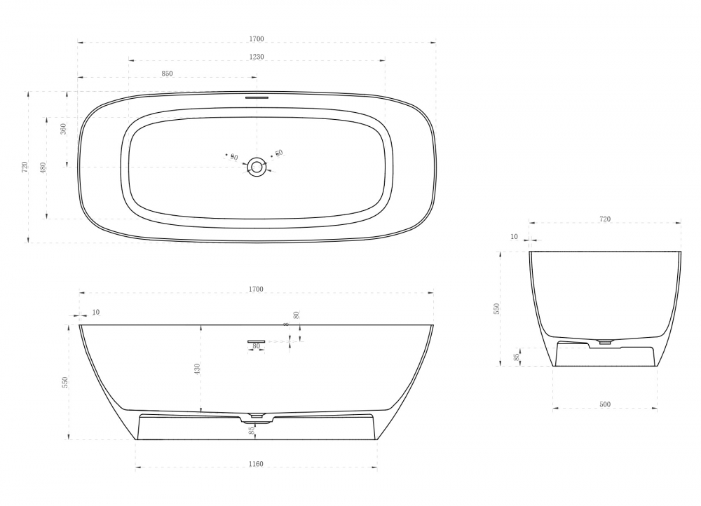 Ванна отдельностоящая Abber Stein 170x72 см AS9612-1.7 из искусственного камня, слив-перелив в комплекте, цвет - белый матовый.