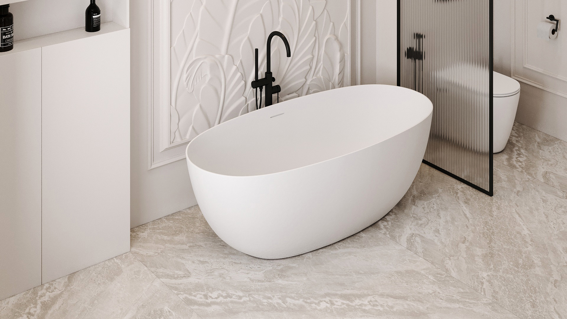 Ванна отдельностоящая Abber Stein 170x75 см AS9624-1.7 из искусственного камня, слив-перелив в комплекте, цвет - белый матовый.