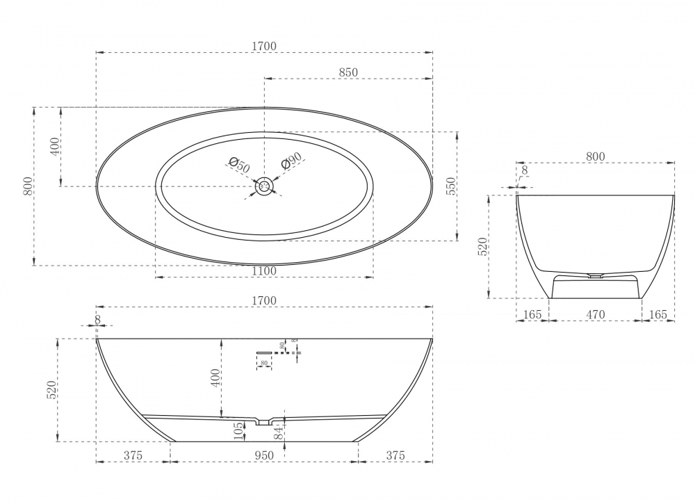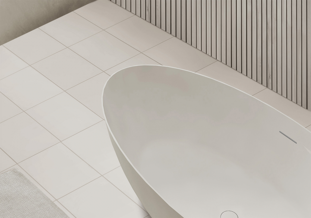 Ванна отдельностоящая Abber Stein 170x80 см AS9625-1.7 из искусственного камня, слив-перелив в комплекте, цвет - белый матовый.