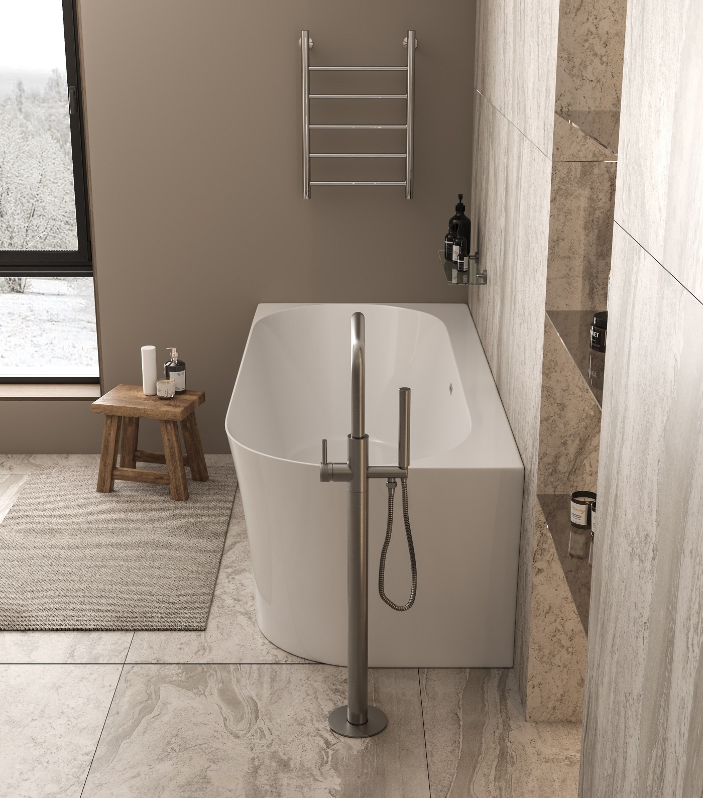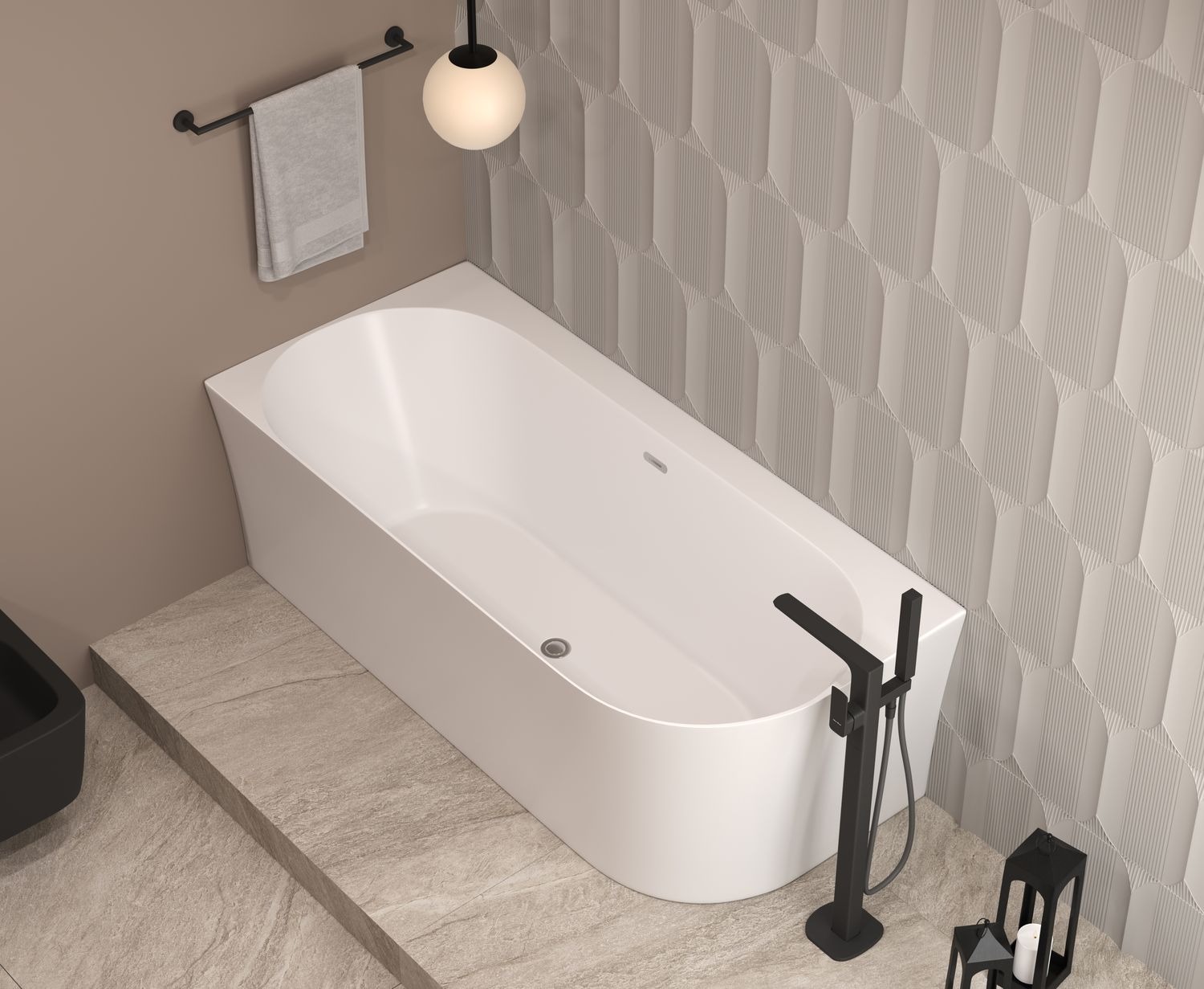 Ванна дополнена располагающейся под комфортным углом и плавно перетекающей в бортик спинкой, которая снимает нагрузку с мышц шеи и поясницы. Чаша со стенками высотой 60 см вмещает до 220 л воды, что подарит настоящее удовольствие от процедур, позволяя полностью погрузиться в воду. Глубина 45 см и высоко расположенный перелив с хромированной отделкой позволят набрать максимальное количество воды, не опасаясь, что она расплещется. Широкий бортик вдоль стены подойдет для размещения гигиенических и уходовых средств. Отверстие для слива встроено точно по центру. Модель отличается устойчивостью, поскольку устанавливается на пол без использования ножек. Ванна не требует дополнения фронтовой и/или боковой панелью. В комплект включен встроенный слив-перелив.