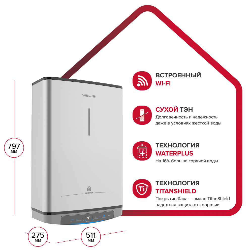 - Функция BOOST - еще больше горячей воды, благодаря попеременной работе двух ТЭНов 1,5 кВт/1,5 кВт и увеличению максимальной температуры до 80 °С