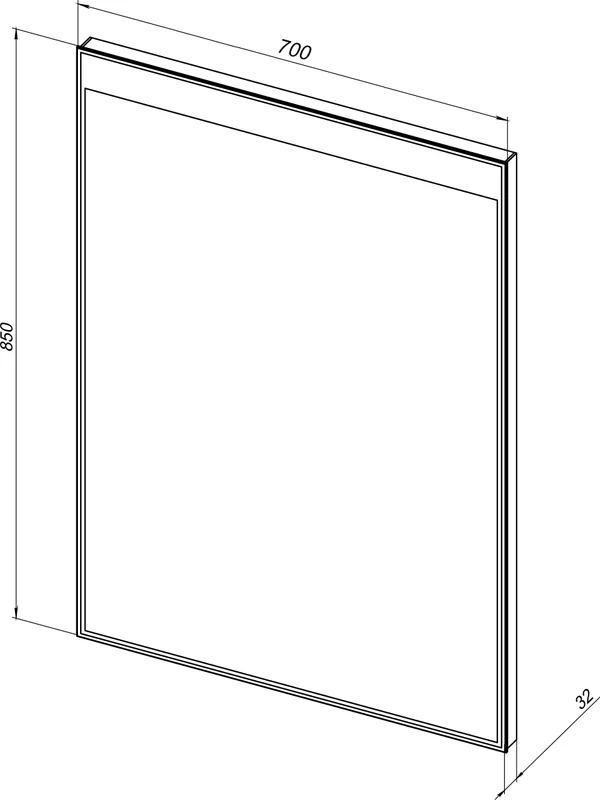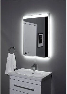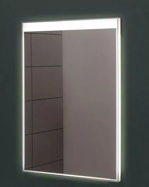 - Тоненькая светящаяся полоска по всему периметру этого четырехугольного зеркала – LED-светильник. В верхней части она перетекает в широкую рамку.