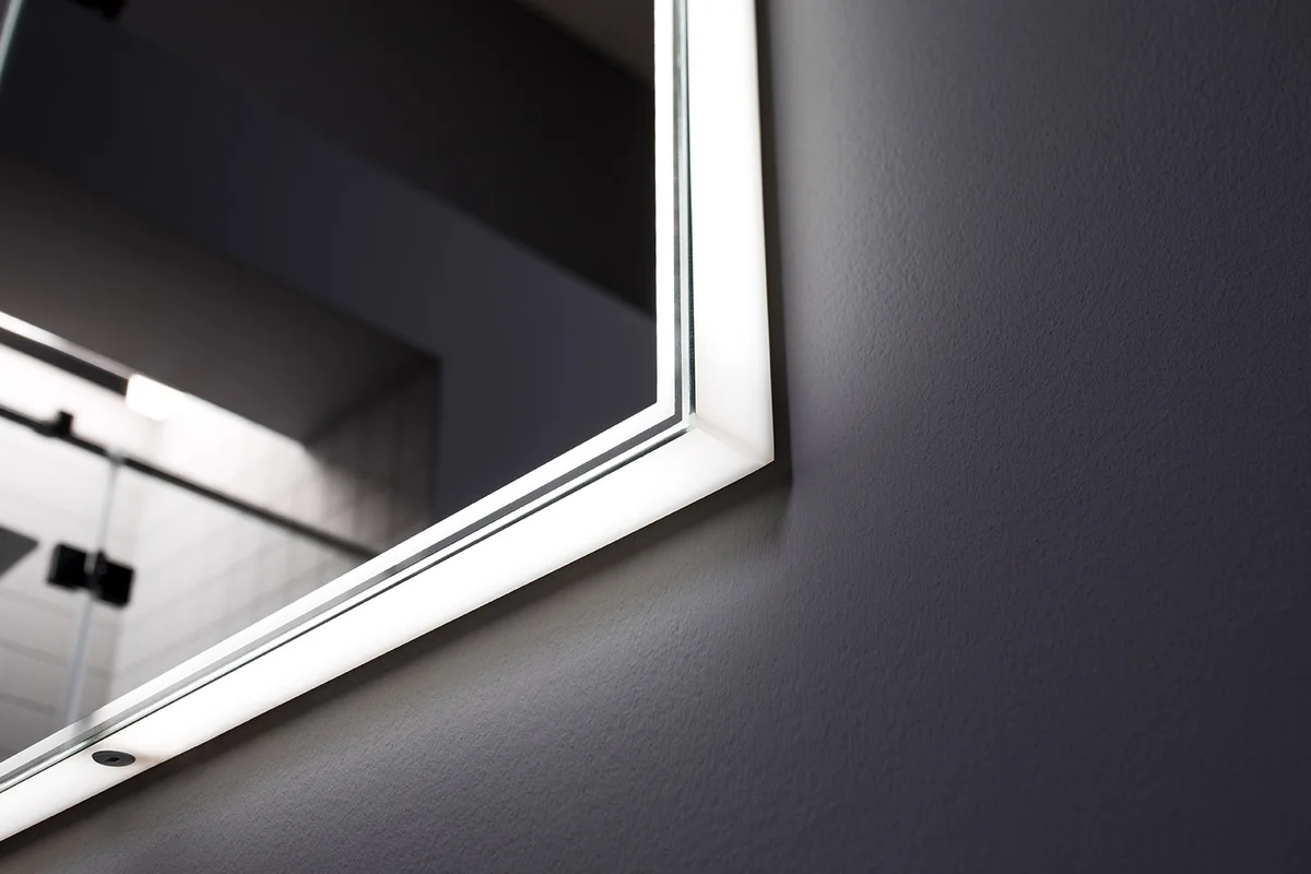 - Включение и выключение светильника происходит с помощью инфракрасного датчика, а он расположен в нижней части зеркала, то есть на той стороне, которая находится напротив широкой светящейся полосы.