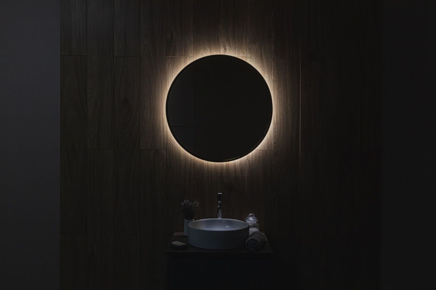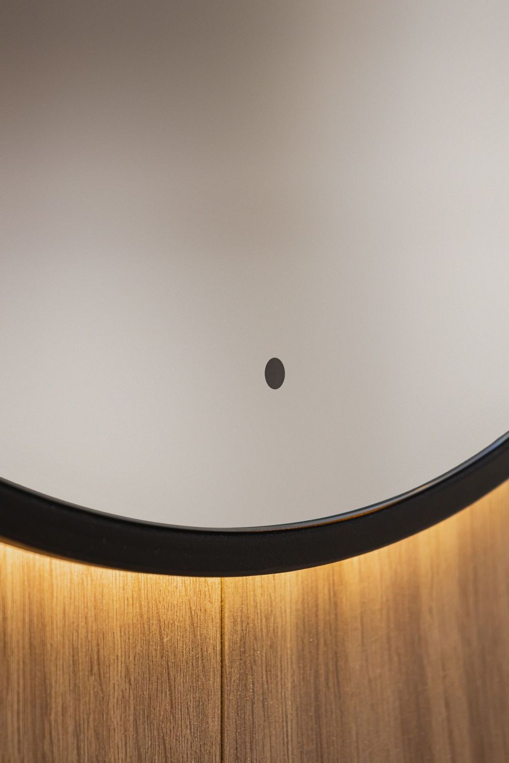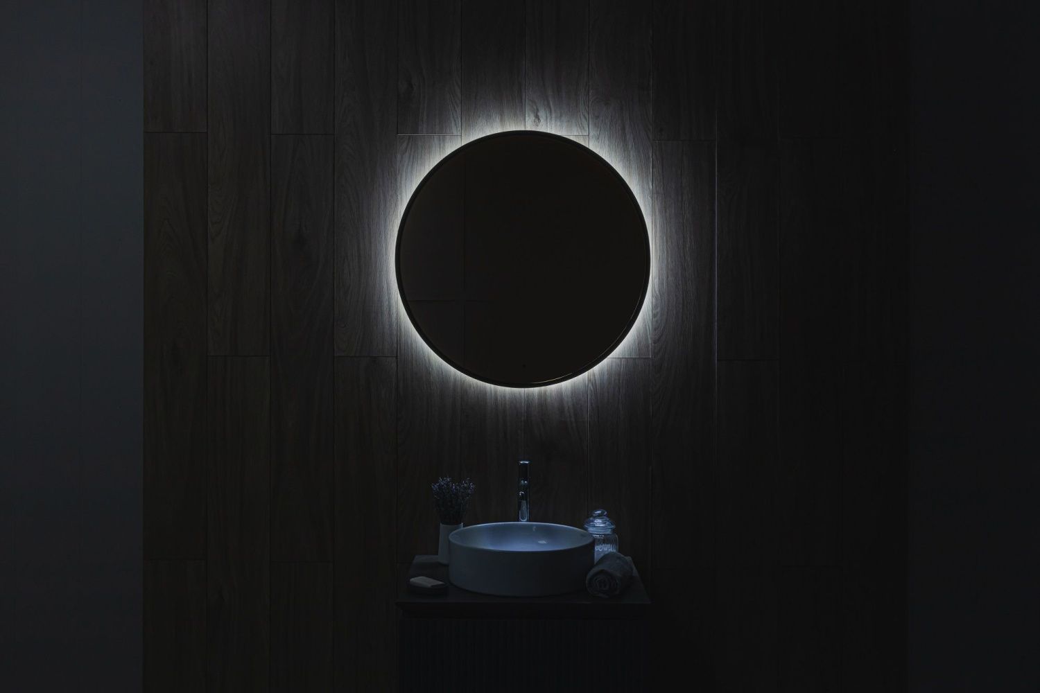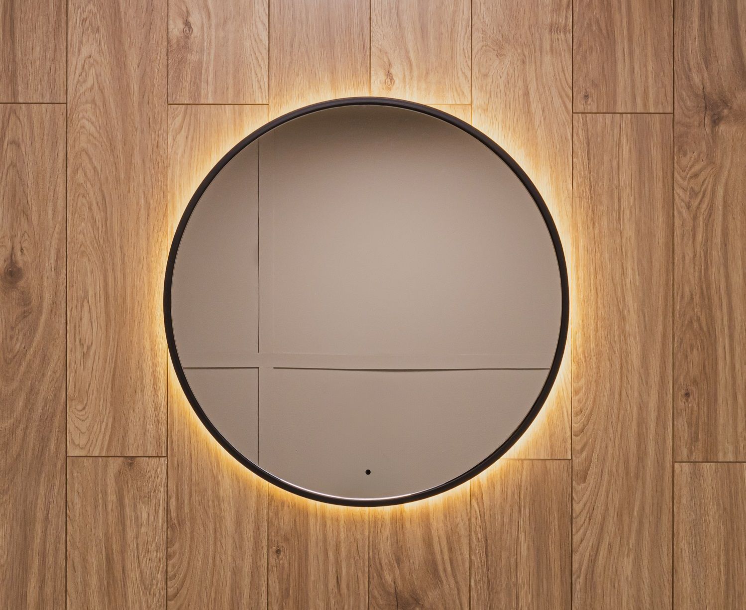 - Ореольная подсветка подчеркивает форму зеркала и создает эффект парения.
