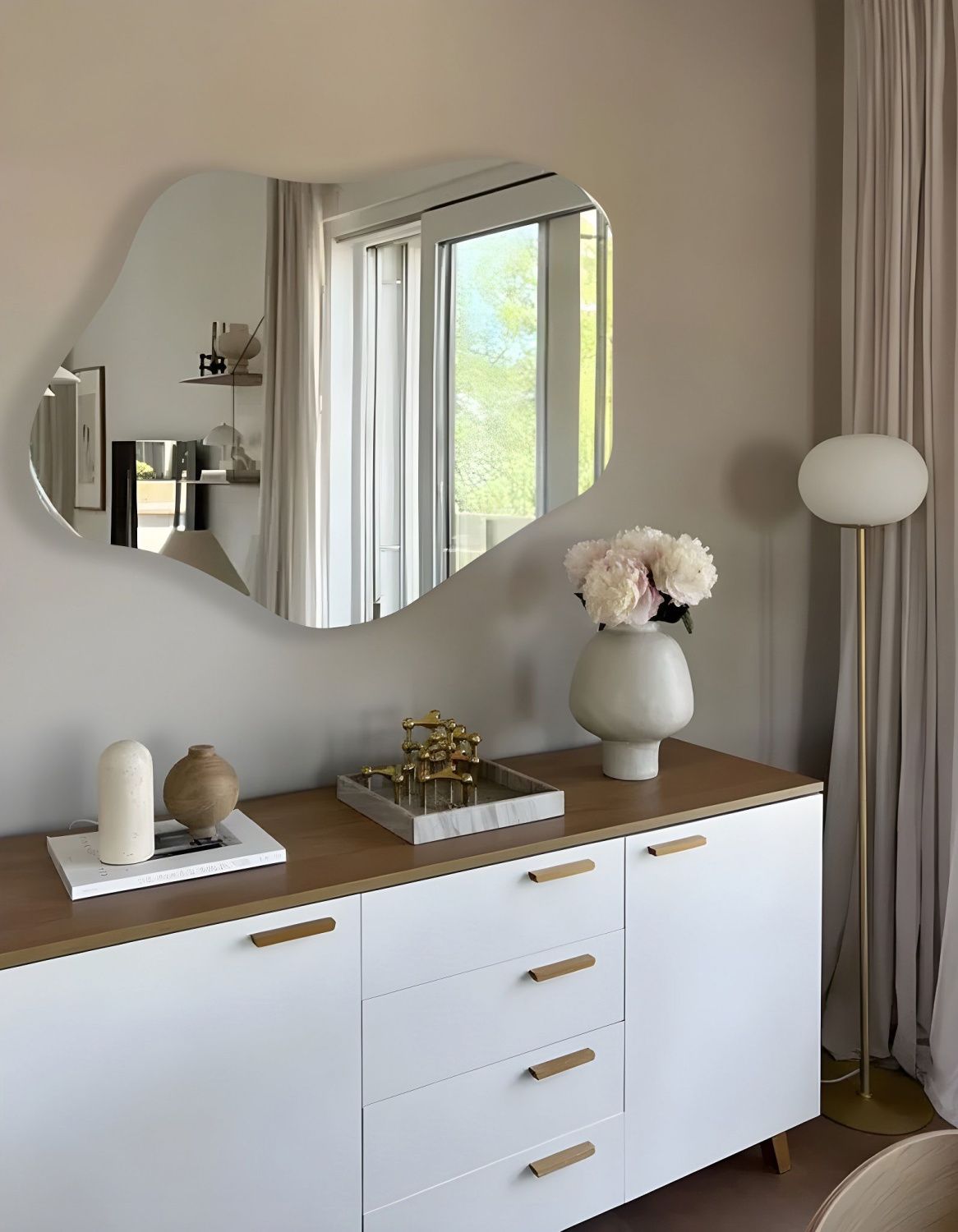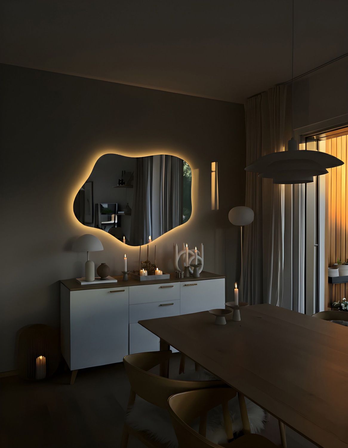 - Ореольная подсветка подчеркивает форму зеркала и создает эффект парения.