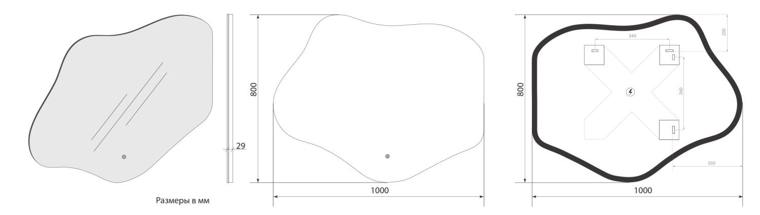- Подсветка активируется на взмах руки в 3-5 см от сенсора, расположенного на зеркальном полотне.