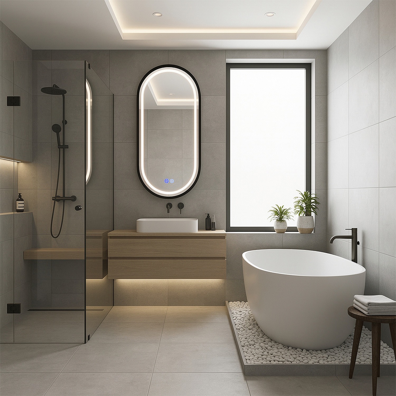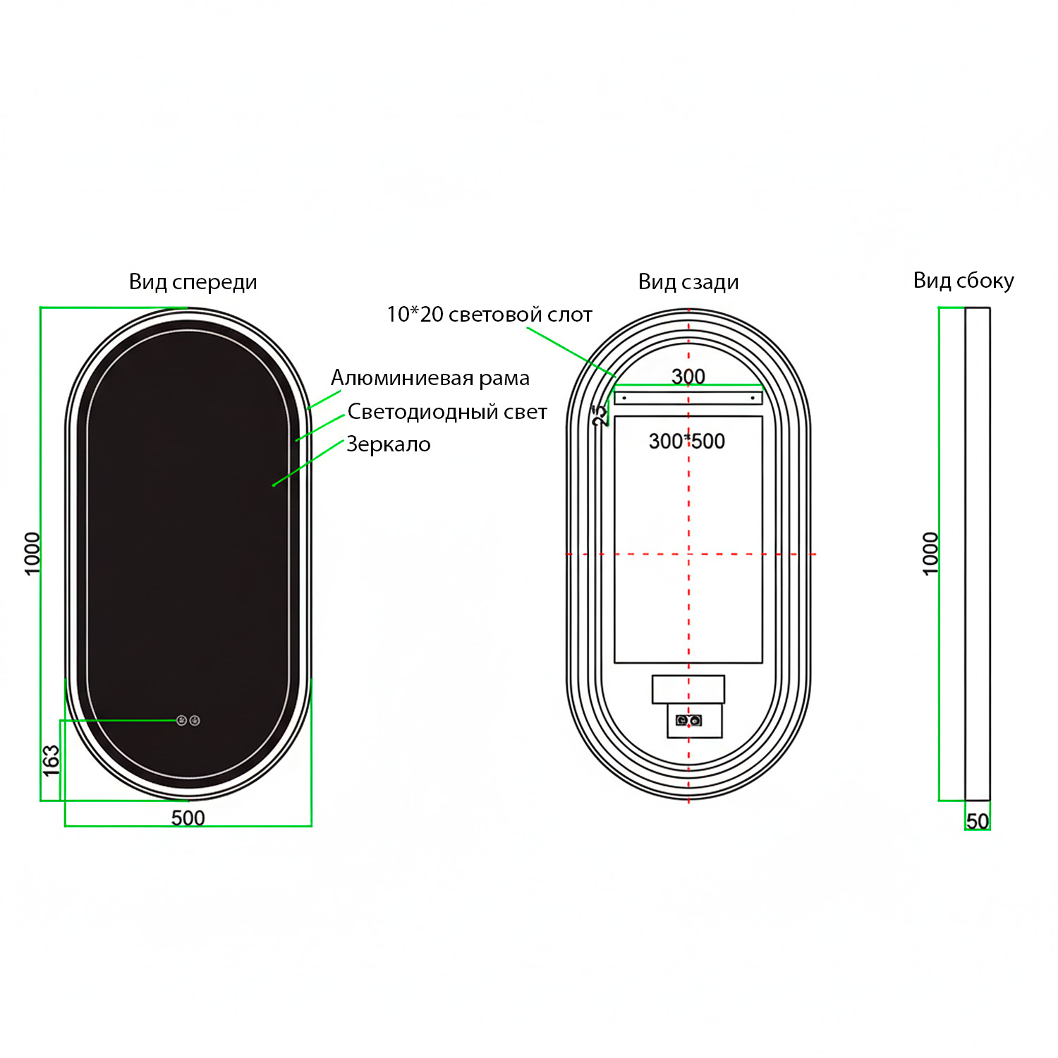 - Алюминиевый корпус черного матового цвета: Прочный и стильный алюминиевый корпус обеспечивает долговечность и придает зеркалу элегантный, современный вид.
