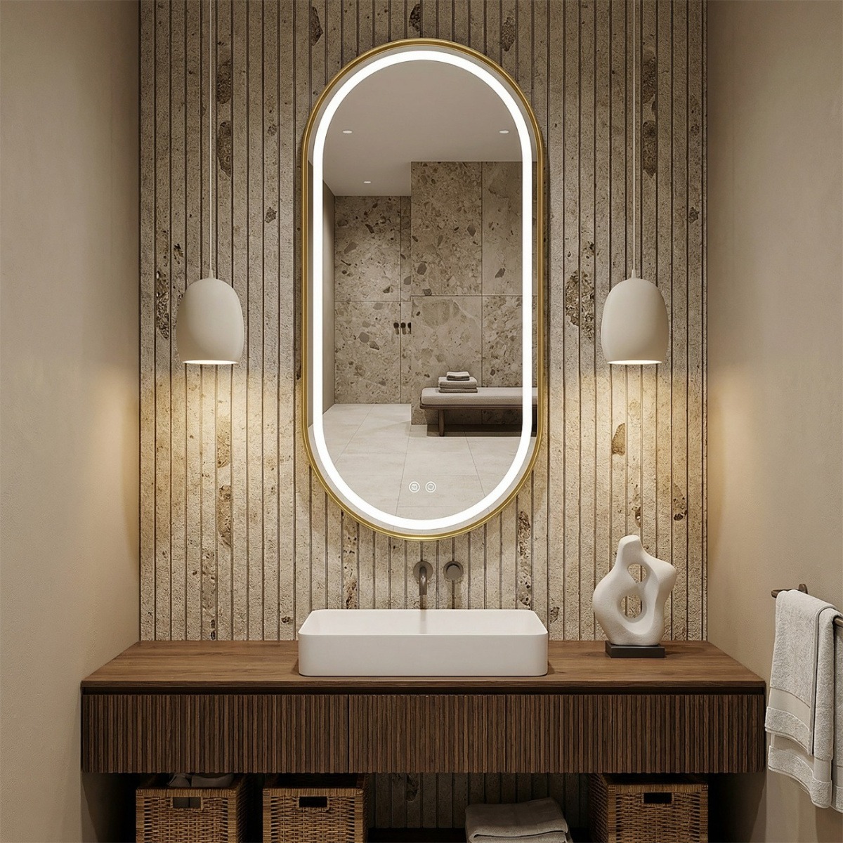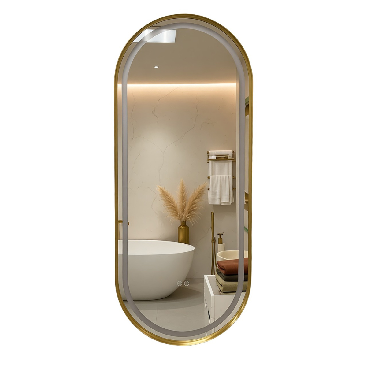 - Матовая Золотая Алюминиевая Рамка: Изысканная матовая золотая алюминиевая рамка придает зеркалу роскошный и современный вид. Этот благородный оттенок идеально впишется как в классические, так и в современные интерьеры, добавляя нотку элегантности и тепла. Алюминий гарантирует долговечность и устойчивость к коррозии, что особенно важно для влажных помещений.