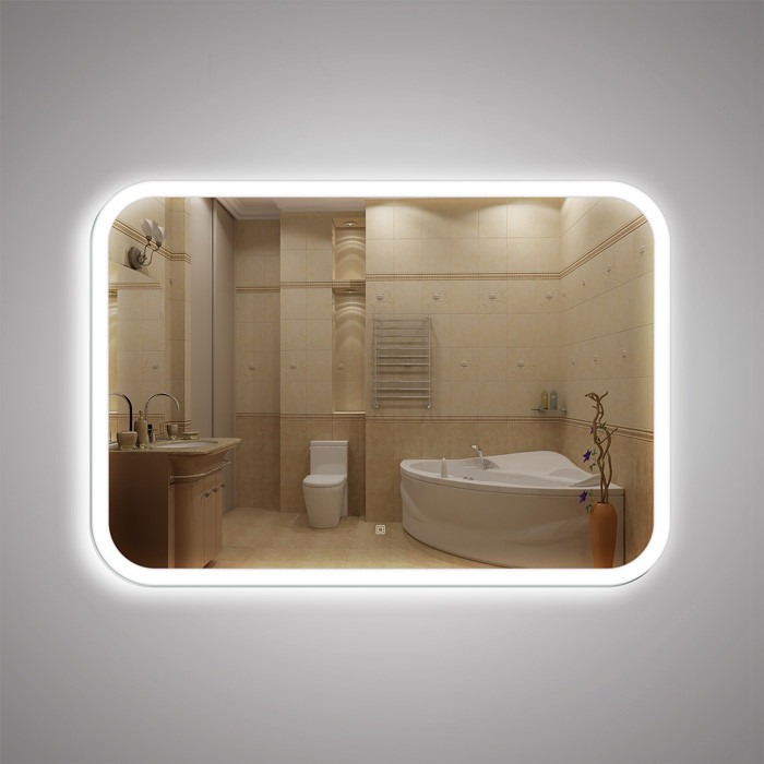 Зеркало 341 с LED подсветкой 9,6 Вт по периметру переходящей на фон (светодиодная лента) 70 х 100 см - изготовлено из влагостойкого полотна, с еврокромкой по периметру, с внутренним алюминиевым профилем толщиной 20 мм, с сенсорным выключателем и сетевым проводом с вилкой.