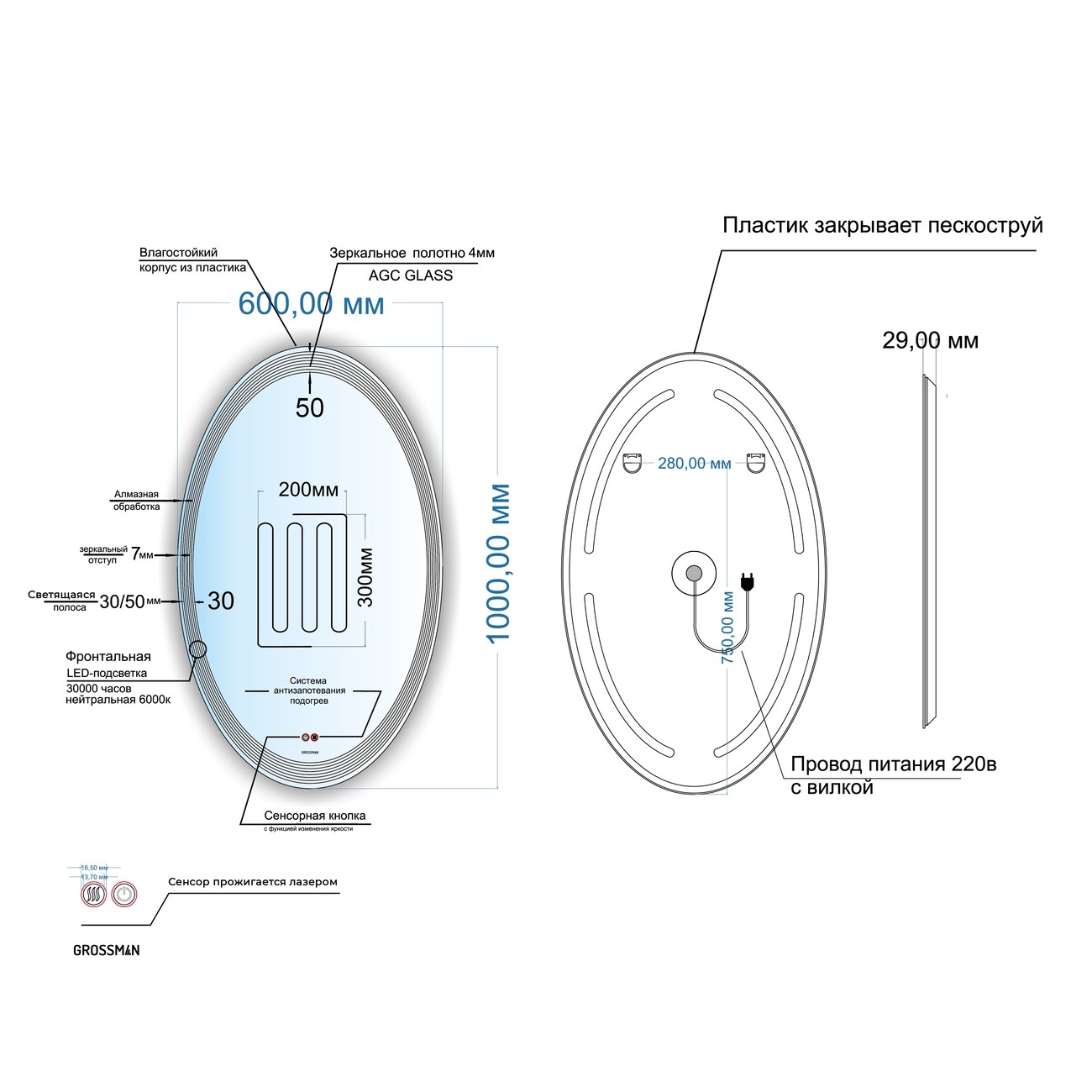 Зеркало Grossman Атрио 60 см 2260100 с Led-подсветкой, подогревом и сенсорным выключателем.