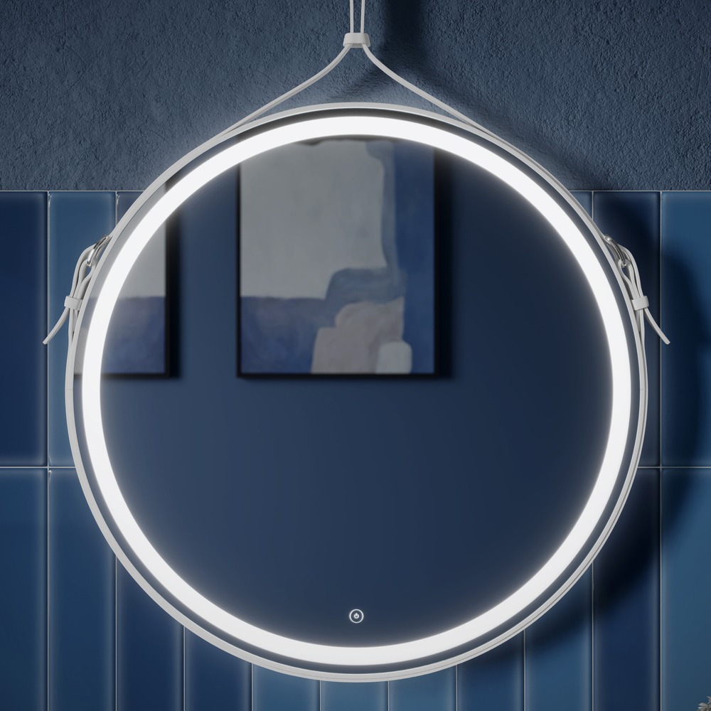 - Зеркало для ванной комнаты круглое с ремнем из натуральной кожи белого цвета