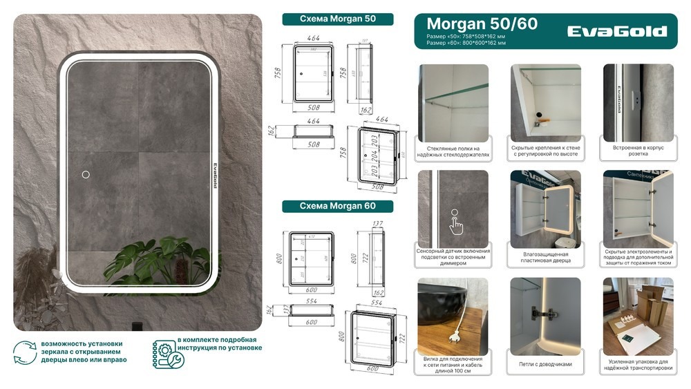 Зеркало-шкаф EvaGold Morgan 60 см EG010323 с Led-подсветкой, диммером и сенсорным выключателем.